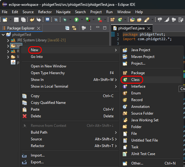 | * <b>{{Code|phidget21.jar}}</b> is the Phidget Java library for JDK <i><b>1.4.2</b></i> or higher. Your compiler has to know where this file is. By default, it is placed into {{Code|C:\Program Files\Phidgets}}. So, you can either point your compiler to that location, or copy and link to it in a directory for your project workspace. For more information, please see the section for your specific compiler/environment.