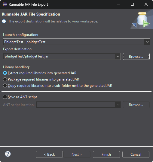 | | | Click on the export icon, and then select your main class and click OK. || [[Image:Language_java_vscode_jar2.png|center|350px|link=https://cdn.phidgets.com/docs/images/7/74/Language_java_vscode_jar2.png]] |